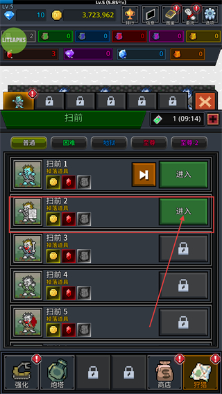 2、在狩獵界面中,選擇【掃前2】對應(yīng)的【進入】按鈕,開啟該關(guān)卡挑戰(zhàn),獲取金幣、紅寶石等掉落道具資源。