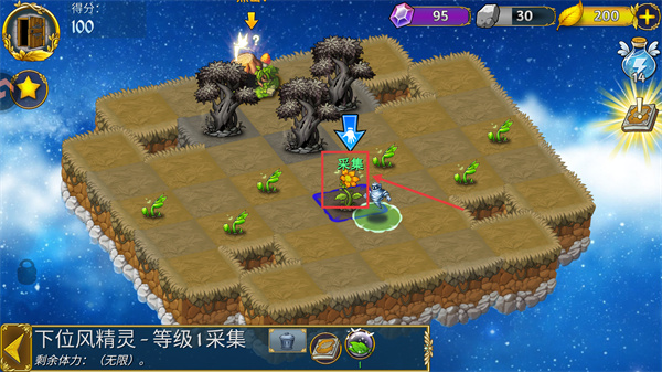 2、操控風(fēng)之精靈進(jìn)行【采集】行動,利用【無限】體力收集資源,注意右上角三種資源數(shù)值變化。