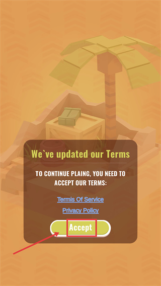 1、游戲更新條款后,需點(diǎn)擊【Accept】按鈕,同意【Terms-Of-Service】與【Privacy-Policy】,才能繼續(xù)游玩。