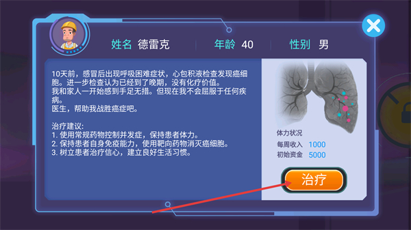 2、查看患者【德雷克】的病情信息與治療建議,確認其【初始資金-5000】等狀態(tài)后,點擊【治療】按鈕啟動診療流程。