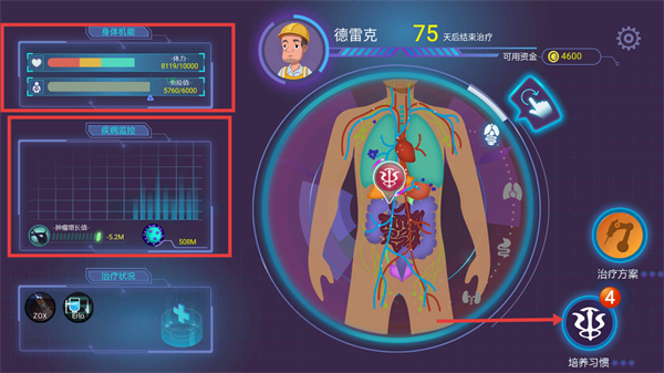 3、在治療界面關(guān)注【身體機能】的體力-免疫值數(shù)據(jù),通過【疾病監(jiān)控】跟蹤腫瘤增長,借助【治療方案】-【培養(yǎng)習慣】推進治療。