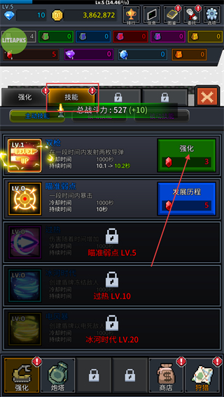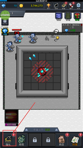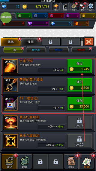 1、在【關(guān)卡3-1】界面點(diǎn)擊底部的【強(qiáng)化】按鈕,進(jìn)入強(qiáng)化界面,準(zhǔn)備提升炮塔相關(guān)的屬性與戰(zhàn)力。