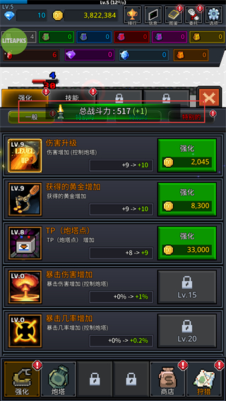 3、完成【傷害升級】的強(qiáng)化操作后,總戰(zhàn)斗力隨之提升,可繼續(xù)選擇其他強(qiáng)化選項(xiàng),進(jìn)一步增強(qiáng)炮塔的綜合戰(zhàn)力。