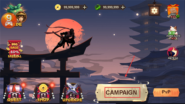 1、進(jìn)入游戲后優(yōu)先點擊【CAMPAIGN】開啟主線,同時可利用【QUEST】【SHOP】【UPGRADE】功能輔助推進(jìn)進(jìn)度。