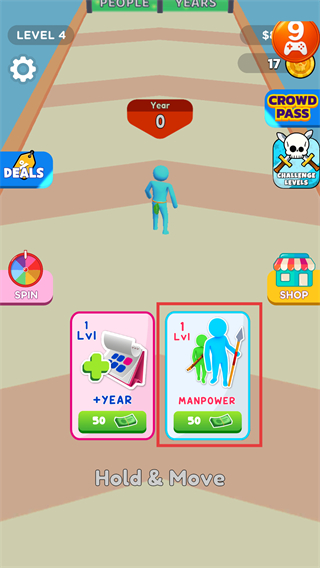 1、按【Hold-&-Move】提示操作,可花【50】金幣解鎖【MANPOWER-Lv1】提升關(guān)卡能力。