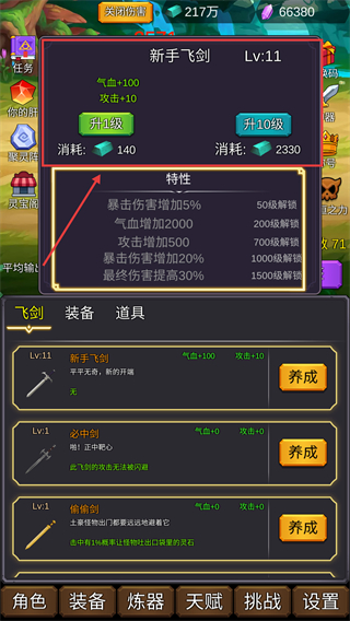 1、優(yōu)先升級【新手飛劍】通過【升1級】或【升10級】消耗資源提升攻擊氣血,解鎖特性增強戰(zhàn)力。
