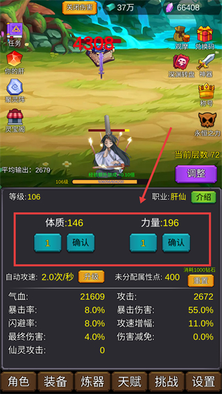 2、根據(jù)【肝仙】職業(yè)分配【體質(zhì)】和【力量】屬性點,體質(zhì)加防御力量加攻擊提升戰(zhàn)斗能力。