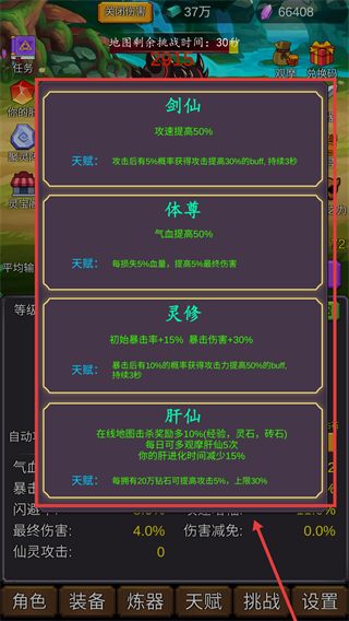 3、選擇【肝仙】天賦可提高在線獎勵與進化速度增強掛機效率,也可按需選【劍仙】【體尊】。