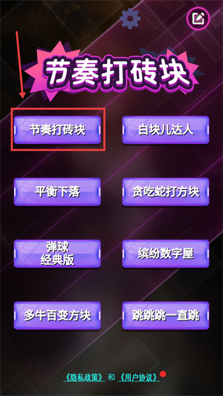 1、進入游戲后,選擇【節(jié)奏打磚塊】模式開啟游玩,同時可查看其他模式如【白塊兒達人】等后續(xù)解鎖選項。