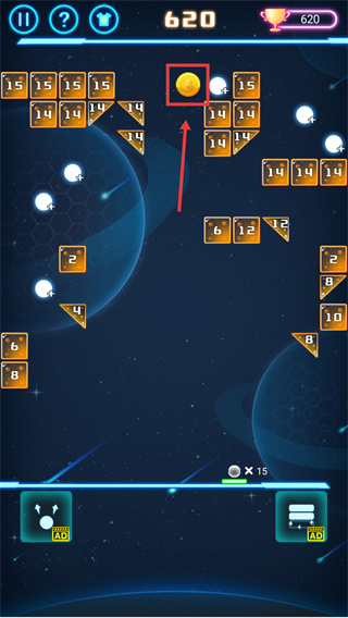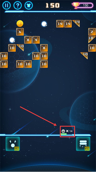 2、游玩中注意底部【白球×14】的數(shù)量,控制白球彈射方向,優(yōu)先消除數(shù)字磚塊積累分數(shù),提升關(guān)卡進度。