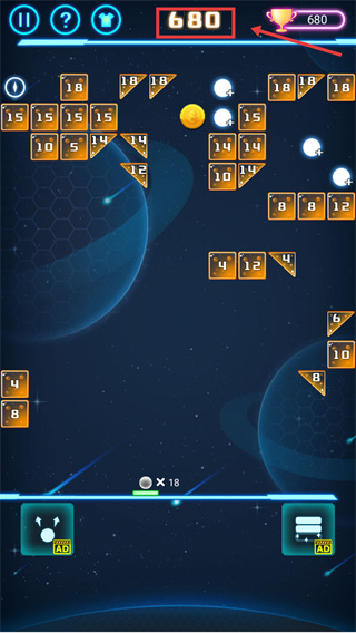 4、關(guān)注頂部【680】分數(shù)與獎杯進度,通過連續(xù)消除磚塊提升分數(shù),解鎖更高關(guān)卡的挑戰(zhàn)資格。