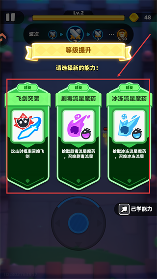 3、等級提升時(shí)會彈出能力選擇界面,可從【飛劍突襲】等技能選項(xiàng)中選其一。