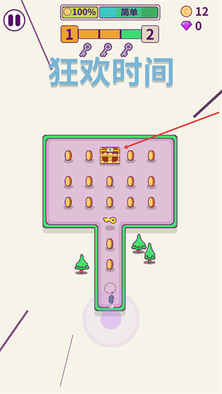 3、怪物被清除后進(jìn)入“狂歡時(shí)間”環(huán)節(jié),路徑上會出現(xiàn)寶箱與大量金幣,收集這些資源可提升關(guān)卡收益。