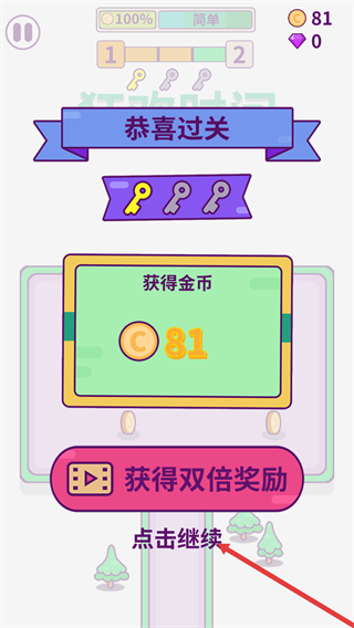 4、關(guān)卡完成后顯示“恭喜過關(guān)”,點(diǎn)擊“點(diǎn)擊繼續(xù)”按鈕即可進(jìn)入下一個(gè)關(guān)卡。