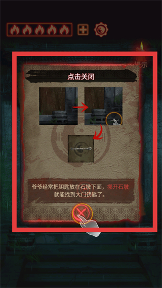 2、查看提示內(nèi)容后點擊關(guān)閉,了解到鑰匙在石墩下,需挪開石墩找鑰匙,明確打開大門的前置操作方向。