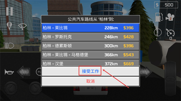 1、選擇【柏林-萊比錫】等路線后,點(diǎn)擊【接受工作】即可承接對(duì)應(yīng)運(yùn)輸任務(wù),獲取對(duì)應(yīng)里程-報(bào)酬。