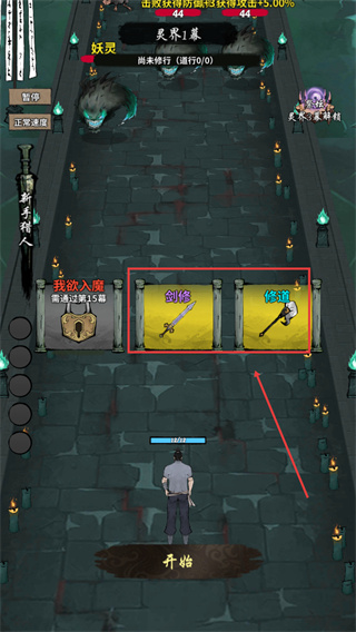 2、進入【靈界1幕】后,選擇【劍修】或【修道】職業(yè)分支,確定后點擊【開始】即可進入對應(yīng)戰(zhàn)斗場景。