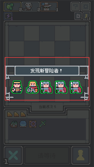 1、在【當(dāng)前波次5】界面,確認(rèn)【發(fā)現(xiàn)新冒險(xiǎn)者】對(duì)應(yīng)的陣容,提前規(guī)劃隨從部署位置,為后續(xù)防御做準(zhǔn)備。