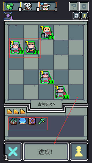 2、將隨從部署到棋盤適配位置,搭配底部道具后,點(diǎn)擊【進(jìn)攻!】按鈕,對(duì)新冒險(xiǎn)者發(fā)起防御反擊。