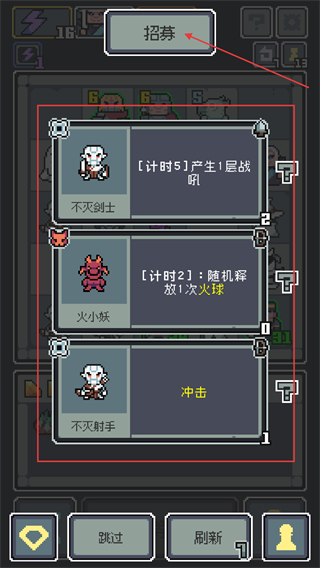 3、點(diǎn)擊頂部【招募】按鈕,選取【火小妖】這類短計(jì)時(shí)隨從,借助其火球技能補(bǔ)充陣容的遠(yuǎn)程輸出能力。