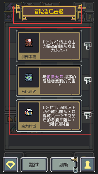 4、擊退冒險(xiǎn)者后,選擇【訓(xùn)練木樁】財(cái)寶,讓場(chǎng)上攻擊力最高的隨從永久加攻,強(qiáng)化后續(xù)波次的戰(zhàn)斗能力。